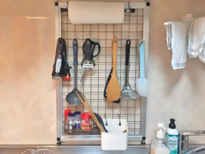 片側面にはパンチングボード(有孔ボード)を。これもちょうどいい厚みで、綺麗に取り付けることができました。アルミフレームにパンチングボードは初めて使ったのですが、見た目にも相性が良くてびっくり。木材と合わせると、工業製品っぽさもそこまでなく、いい感じです。