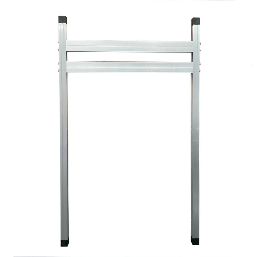 図のように両端につけたアルミ材と縦フレームに穴をあけてボルトで両方の穴を通し、ナットで裏から手締めで固定します。