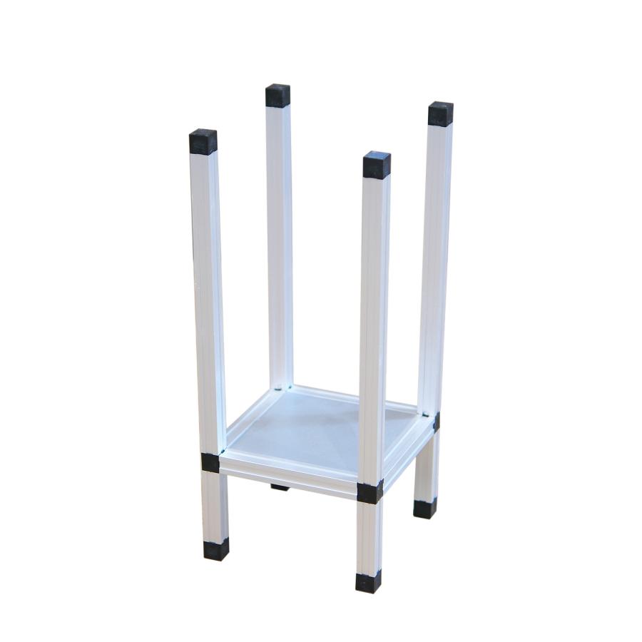 今回はアルフレーム16mシリーズのフレームとジョイントを使用しました。スタンド底面の棚板には、アルミ複合板を使用しています。