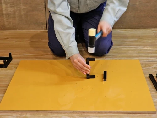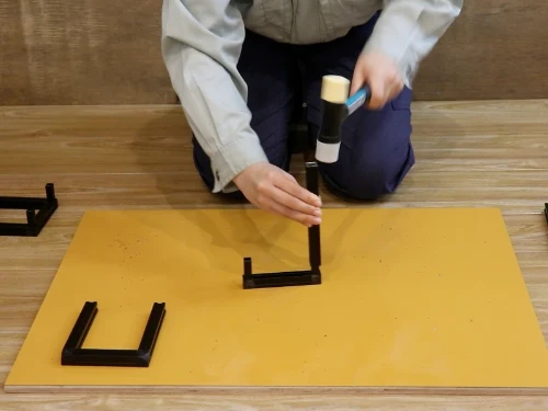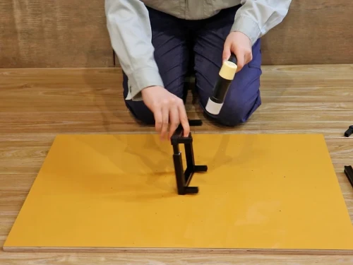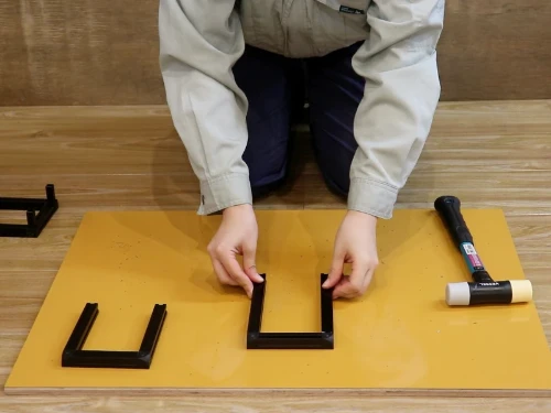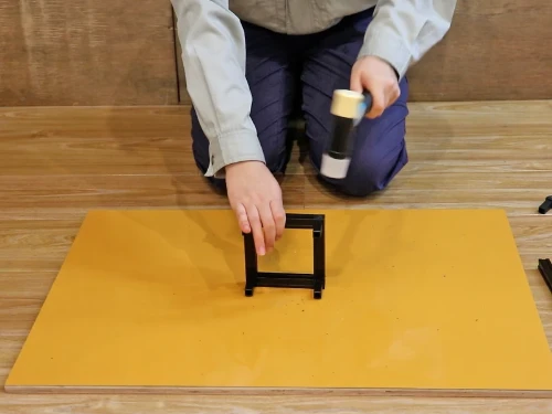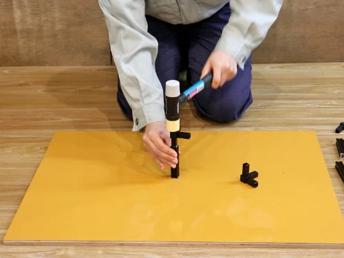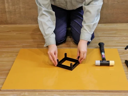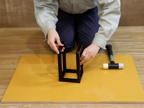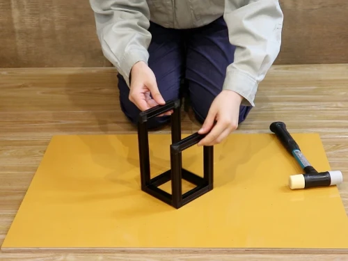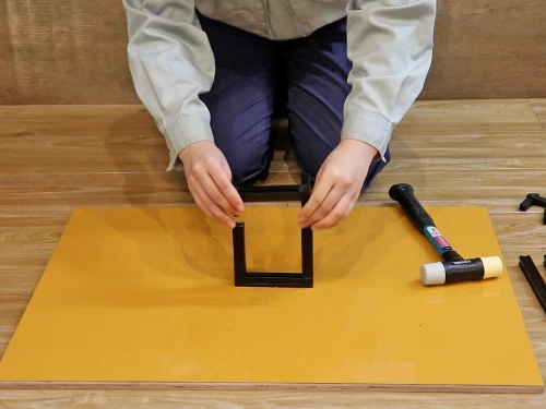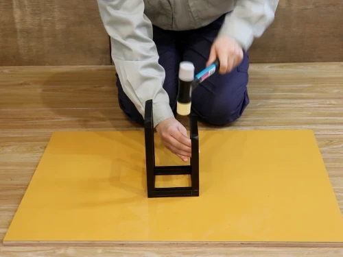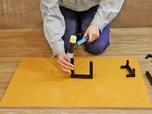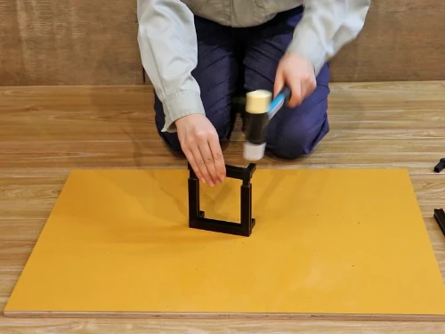 はじめにゴミ袋ホルダーの底面を組み立てます。プラスチックハンマーを使って、フレームの両端にジョイントをたたき入れます。