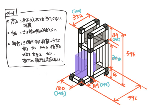 練り直した2案目がこちら。1案目でゴミ捨ての邪魔になる原因だった棚板をなくし、ゴミ袋をひっかける位置と書類を置く位置にそれぞれ二本のフレームをつなげました。