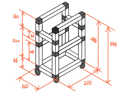 上段に書類、下段にゴミ箱を置いて使うイメージです。机の下に置く追うなスリムタイプのゴミ箱を参考に、机の下にしまえて、足元の邪魔にもならないサイズを目指してみました。