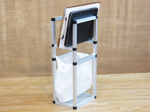 書類は上側につけているフレームの上に載せる形に。長辺側のフレームをなくしたことで隙間ができ、ゴミを捨てやすくしました。下側にはゴミ箱を置くのではなく、ゴミ袋を掛ける使い方に変更しました。ゴミ袋だけでなくレジ袋も使えるように、フレームに袋をひっかけたあとチャンネル材(コの字型のアルミ部材)をフレームの上からはめ込むことで、袋を固定します。