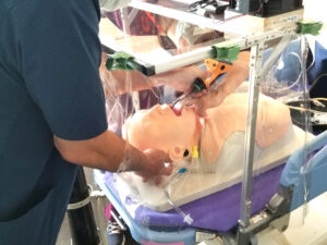 医師が患者の気道を確保するための気管挿管という処置を行う際、せき等による患者からの飛沫感染を防ぎます。また、医師が処置をストレスなく迅速に行えることを目的として開発しました。(現在千船病院様と共同特許出願中)